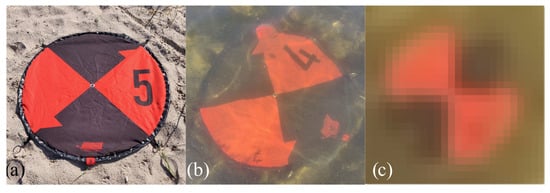 The ground control points shown in Figure 3 have a digit visible on one of the fields and a distinct triangular notch in the orange area within the black field. These features of the GCP were not represented in the SSOs (Figure 4). This was because they were created based on the UAV orthophoto image. Due to the resolution and the influence of the water layer, the aforementioned features of the GCP are not visible in the imagery (Figure 3c) and were not reproduced on the SSOs.