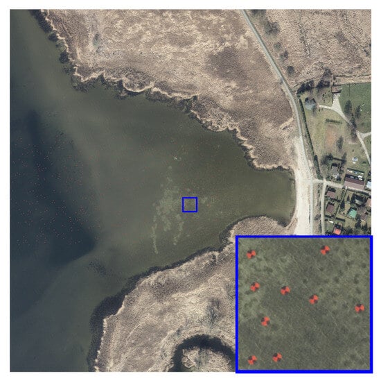 - Set of 129 images from the UAV photogrammetric mission: photos taken in October 2022. These photos show the previously mentioned area of Dąbie Lake in natural colors. There are 152 real GCPs visible in the entire set of photos. These data served as a test set to check the effectiveness of the detection models.