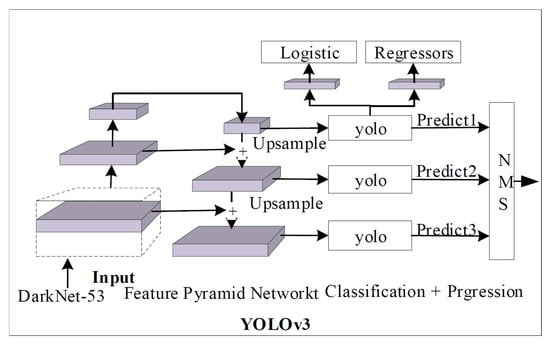 YOLOv3 network framework. Based on figure from “Multi-Scale Ship Detection from SAR and Optical Imagery via A More Accurate YOLOv3” [49].