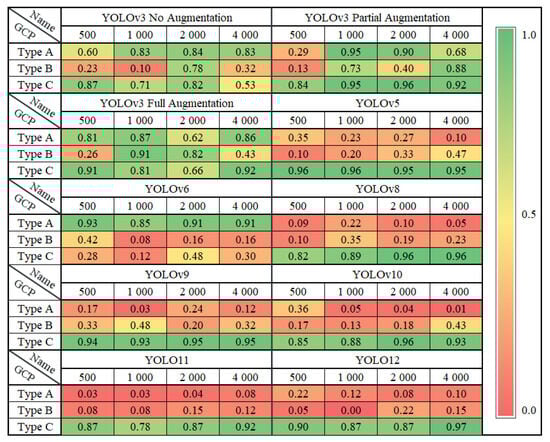 The process of object detection was conducted using the Detect Objects Using Deep Learning tool. It utilized the 36 CNN-based models trained during the previous stages to detect objects on unmodified UAV images. The test set for all models was a set of 129 photos from a UAV mission (2022) and an orthophoto from another one (2022). There was a total of 152 GCPs to be detected in the set of images. The description of the test data is provided in Section 2.2. The results of this experiment are discussed in the results section and summarized in Table 3.