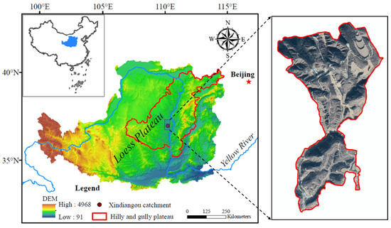 The hilly–gully Loess Plateau, located in the south of the Chinese Loess Plateau, is characterized by severe soil erosion due to the relatively harsh terrain, vegetation and precipitation conditions [35,36]. Slope–gully systems are the basic geomorphic unit, as well as the major sediment source in this area. Xindiangou catchment, a small catchment typical of the hilly–gully Loess Plateau, covers an area of approximately 1.44 km2 (Figure 1). It has a typical temperate continental semi-arid monsoon climate with an average annual rainfall of 475.9 mm and mean temperature of 10.2 °C. Rainfall here has the characteristics of short duration and high intensity, and is mainly concentrated between June and September. The surface materials of the basin are predominantly loess soil, characterized by a loose texture and strong water absorption capacity, but weak a water retention capacity, making it highly susceptible to erosion. The loess layer has a thickness of approximately 60 m, with Malan loess in the upper section and Lishi loess partially exposed in the partial gully bottom. The soil is relatively rich in potassium and calcium, but very low in organic matter and nitrogen; the organic matter content is around 0.3% [37]. The catchment is topographically complex and fragmented, with a gully density of 7.26 km/km2, which covers 46.8% of the area of the entire basin. The dominant vegetation type is herbosa, including Ziziphus sativa, Atemisia gmelini, Stipa bungeana.