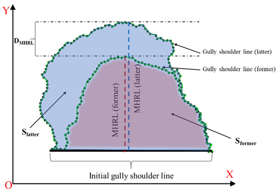 The point clouds of the gully shoulder line were plotted in an O-XY coordinate system after each experiment so as to quantify the retreat and change processes of gullies’ heads (Figure 3). The Y axis followed the gully head retreat direction, while the X axis was parallel to the gully shoulder line. The maximum gully head retreat lengths (MHRLs) of various experiments were measured using the gully point cloud data by means of the Terrasolid version 08.11.09.292. Then, the rate of gully head retreat (V) could be derived by the ratio of the difference in maximum gully head retreat lengths (DMHRL) between the former and latter trials and the duration of a single experiment, and this was employed to describe the changing velocity of the gully shoulder line with erosion processes. The area of gully head retreat (S) was determined from the area of the region enclosed by the receding shoulder line and the original shoulder line.