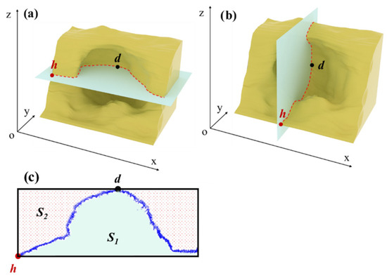 Alcoves formed and developed on the gully slopes during the experiments. In the current study, taking the maximum depth point (the point d in Figure 4) of the alcove during a single experiment as the reference point, the longitudinal and cross profiles perpendicular to the z and x axes were set up, respectively. These profiles were employed to analyze the horizontal and vertical developmental characteristics of the alcove on the gully slope. The concavity index was usually to describe the degree of depression of the cross-sections of permanent gullies at the catchment scale [42], which is similar to the continuous widening and concaving of the gully slope in the runoff plot. Thus the horizontal concavity index (CIc) and vertical concavity index (CIv) were adopted in an attempt to quantify the morphological characteristics of concave expansion on the gully slope. The distance between the point with the minimum y-value at the intersection of the profile and the gully slope (i.e., the point h in Figure 4) and the point of maximum depth is represented by the two sides of the rectangle, while the concavity index represents the ratio of the area of the concave profile (S1) to the area below the concave profile (S2) in the rectangle.