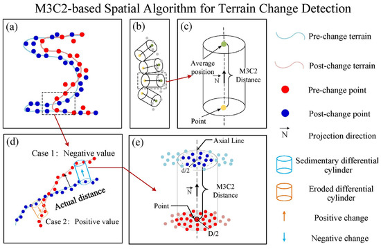 Illustration of the M3C2 algorithm. (a) Reference point cloud (the red dots) and comparison point cloud (the blue dots); (b) Cylinder creating; (c) Distance calculation; (d) positive and negative terrain changes determining; (e) M3C2 distance.