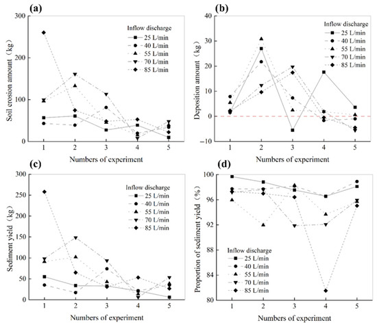 The amount of soil erosion on the gully slope generally showed a decreasing trend under different flow discharge rates. Specifically, the amount of erosion decreased slowly with the rate of 25 L/min throughout the whole experiment, while an abrupt increase was detected during the second experiment using 55 and 70 L/min, as well as the third experiment using 40 L/min. In contrast, the amount of erosion dropped dramatically from the first trial (260.2 kg) to the second trial (74.6 kg) under the greatest flow condition (85 L/min), and then remained basically stable. The overall change trends of sediment yield were downward under different flow discharge rates, basically coinciding with the erosion amount. In contrast, the deposition amount displayed by the gully slope was relatively small for different flow discharge rates. For the 25 L/min flow discharge rate, the deposition amount showed large fluctuation characteristics during the five experiments. The deposition reached its peak immediately in the second experiment when moderate flow discharge was applied (40 and 55 L/min), then gradually decreased to a lower magnitude. Similarly, the amount of deposition under the large flow condition (70 and 85 L/min) increased and then decreased with the number of experiments, while transition occurred in the third experiment.