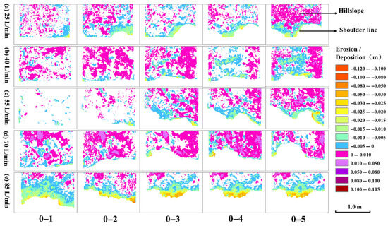 The soil and deposition maps of the gully slope show that erosion was mainly distributed in the upper part of the gully slope, and the deposition was mostly concentrated at the bottom (Figure 8). The bottom deposition situations for the 70 L/min and 85 L/min flow discharge rates were relatively serious compared with other rates. The erosion range and erosion degree expanded throughout the entire experimental process under all flow discharge rates, whereas the spatial distribution showed certain differences. For the 85 L/min flow discharge rate, almost the entire original gully slope showed erosion characteristics, with the erosion depth greater than 0.1 m just one experiment later. Subsequently, the erosion intensity continued to increase, and a contiguous area with an erosion depth exceeding 0.8 m could be found on the right side of the gully slope after the fifth experiment. Similar erosion development processes on the gully slope were observed at 55 L/min and 70 L/min flow discharge rates. The difference was that the erosion intensity and erosion range were relatively low after the first experiment, and the high-value area was mainly concentrated on the left side. In contrast, no areas of change and few areas of deposition could be identified in the upper parts of the gully slope at low flow discharge rates (25 and 40 L/min), even after five scouring experiments, and the erosion depth in areas with intense erosion ranged from 0.3 m to 0.5 m. In particular, the area of severe erosion shifted from right part to left part after the third experiment at 25 L/min discharge due to the gully head’s retreat.