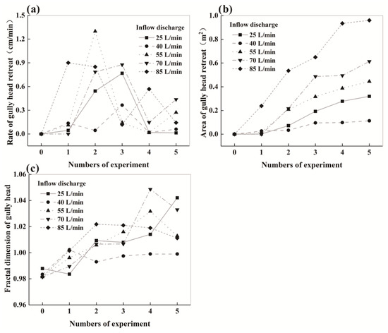 The rate of gully head retreat was extremely high in the first and second trials (0.90 and 0.85 cm/min, respectively) at 85 L/min flow discharge, and it reached its maximum in the first trial (Figure 9a). Then, the overall retreat rate of the gully head decreased in the following experimental sessions. With the other four discharge rates, the retreat in the first experiment was considerably slower than that seen with 85 L/min discharge. This indicates that the gully head cloud collapsed and receded rapidly, and then tended to become stable under extreme rainstorm conditions, meaning the retreat processes would be relatively slow at low flow discharge rates. The peak retreat rates were seen in the second and third experiments, and then decreased. Specifically, the peak value of retreat rate (1.30 cm/min), which was the maximum value seen in all trials, was noted in the second trial with a 55 L/min discharge rate. Meanwhile, the peak values of the retreat rate at high flow discharge rates (55, 70 and 85 L/min) were greater than those of low flow discharge rates (25 and 40 L/min). Further, the fluctuation in and value of retreat rate were generally low across all experiments with the 40 L/min flow discharge rate.