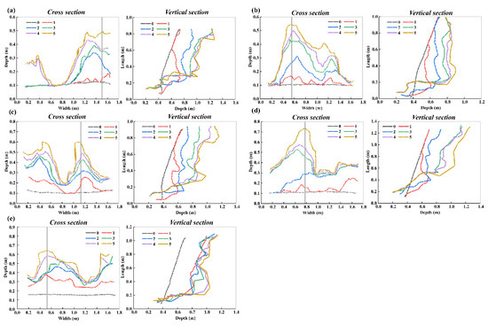The changes in cross-section lines (images on the left) and vertical section lines (images on the right) at maximum concave depth during the experiments ((a) 25 L/min, (b) 40 L/min, (c) 55 L/min, (d) 70 L/min, (e) 85 L/min). The position of the vertical profile is marked by gray lines.