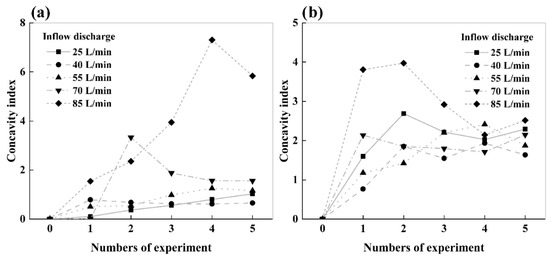 The concavity index of horizontal expansion presented relatively large changes under the two maximum flow discharges. Most notably for the 85 L/min discharge, the concavity index increased continuously in the first four trials, before reaching its peak and then declining in the fifth experiment. In contrast, the variations in the horizontal concavity index were moderate under low flow discharge rates, suggesting a slow increase or steady state. The concavity index of vertical expansion showed a general similar pattern under different discharge rates (Figure 11), whereby the index increased rapidly in the former experiments, and then descended. Specifically, a considerably greater increase and then sharp drop could be detected under the 85 L/min flow discharge, whereas the index under lower discharges tended to decline slightly after the first or second episode of fast growth. The change characteristics of the horizontal and vertical concavity indexes show that the gully slope may be prone to local rapid downcutting with changes in terrain under high discharge rates, while the expansion would basically continue in the initial formation before being uniformly cut down under low discharge rates after the initial gully shape had formed.