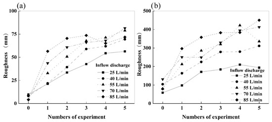 The temporal variations in the roughness of the gully slope under different flow discharge rates. (a) Mean roughness; (b) Maximum roughness.
