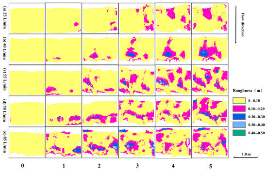 The spatial characteristics of roughness can reflect the response of the surface microtopography of a gully slope to flow discharge and erosion processes. The roughness value displayed visible spatial heterogeneity for different gully slope areas (Figure 13). Compared with the low flow discharge condition, the first trial performed with the two large flow discharge rates (70 and 85 L/min) already yielded a range of high roughness values (above 0.2 m), whereas the roughness value of the gully slope under the lowest flow discharge rate (25 L/min) was lower than 0.20 min throughout the whole scouring experiment. Furthermore, the areas with high roughness values were mainly located in the upper and middle parts of the gully slope under low flow discharge conditions (25 and 40 L/min). The high values were mainly concentrated in this region throughout the whole experiment, with only a certain increase in magnitude and scope. In contrast, the areas of high roughness were mostly distributed in the lower part of the gully slope under the conditions of 55 L/min and 70 L/min flow discharge during the first two trials, after which the distribution was relatively dispersed throughout almost the whole gully slope. The high roughness values were seen to be spread over most areas of the gully slope after the first scouring trial at the flow discharge rate of 85 L/min. Additionally, the local area of high roughness in the fourth trial was reduced compared with the third field with 85 L/min discharge, whereas the scope and magnitude of the high-roughness area under the rest of the flow discharge conditions increased with the progress of the scouring experiment.