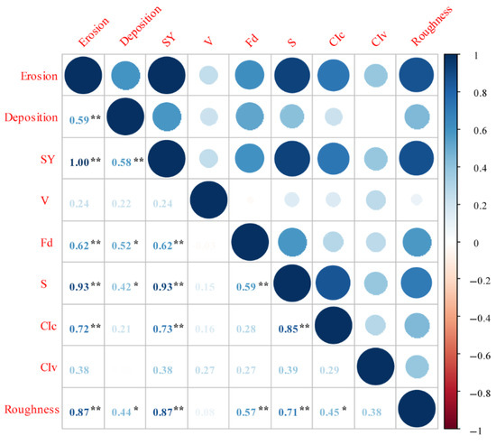 The erosion of the gully slope (especially under the large flow discharge condition) was particularly intense with minimal deposition, resulting in an extremely significant correlation between erosion and sediment yield (SY). The soil erosion and sediment yield of the gully slope were seen to be strongly correlated (p < 0.01) with the fractal dimension of the gully head (Fd), the area of gully head retreat (S), the roughness, and the concavity index of the cross-section (CIc). In particular, the strongest linear correlation was detected between soil erosion and the area of gully head retreat (S), as well as roughness, with correlation coefficients of 0.93 and 0.87, respectively (Figure 14). Thus, the two topographic indicators could be taken as the primary variables characterizing the erosion and sediment yield in the gully slope. On the other hand, the deposition was statistically significantly (p < 0.05) correlated with the fractal dimension (Fd), the area of gully head retreat (S) and roughness, indicating that changes in the erosion terrain of the gully slope might lead to corresponding sediment deposition. Nevertheless, no remarkable or weak correlations were observed between the erosion/deposition/sediment yield and the rate of gully head retreat (V) or concavity index of the vertical section (CIv).