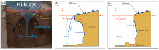The runoff distribution during gully head downcutting (a), and the transformation of jet flow and on-wall flow before (b) and after (c) the collapse of the gully head.