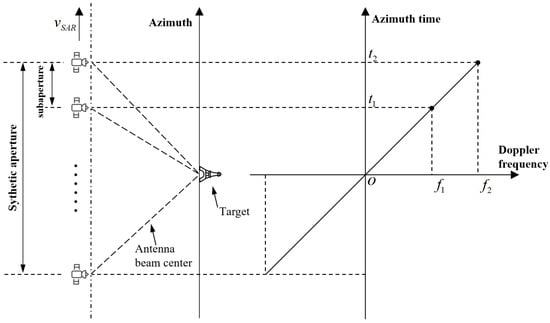 SAR imaging involves coherent integration of low-resolution target echoes acquired across varying squint angles during extended synthetic aperture intervals. These echoes, distinguished by Doppler frequency histories, collectively synthesize the final full-resolution image through azimuth compression. Therefore, each image pixel does not correspond to a singular observation geometry but rather aggregates signals across multiple azimuth frame. This angular diversity enables the decomposition of the full Doppler spectrum into discrete subbands, thereby generating a sequence of low-resolution subaperture images that preserve the original scene coverage. This constitutes the fundamental principle of subaperture decomposition. In broadside mode, the beam of radar is perpendicular to the satellite flight direction, and the Doppler frequency of the target response can be denoted as follows: