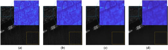 Ablation experiments were performed to verify the effectiveness of each component in the proposed method, with their design aligned with the objective function (Equation (5)). It should be noted that the first term in the equation corresponds to tensor decomposition, which functions as a data preprocessing step rather than a denoising-specific module. Thus, it was not included as an independent variable in the ablation analysis. Instead, subaperture decomposition was treated as an integrated unit in the experiments, where the denoising result of standalone subaperture decomposition is equivalent to multi-look processing. The specific experimental groups and their corresponding configurations are detailed in