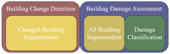 Both building change detection and damage assessment using Remote Sensing (RS) images play a vital role in timely and accurate post-disaster analysis and response [1,2]. Optical RS imagery is one of the most widely used data sources for change detection. Rapid detection of building changes and assessment of damage levels is crucial for disaster response, resource allocation, and recovery planning to minimize loss of life and economic impact [3]. Figure 1 represents the hierarchical structure of building change detection and damage assessment tasks. Specifically, building change detection focuses on identifying changed building areas between bi-temporal images. On the other hand, building damage assessment can be divided into building segmentation, which identifies all buildings in the images, and damage classification, which assesses the severity of damage in segmented buildings.