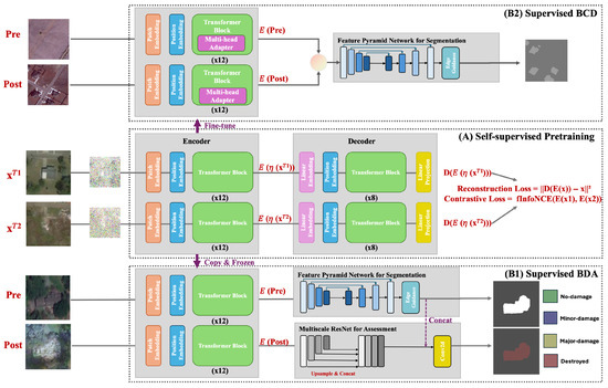 The proposed method consists of three key stages (Figure 2): Self-Supervised Pretraining, Supervised Building Damage Assessment, and Supervised Building Change Detection. This framework integrates self-supervised feature extraction with fine-tuning for both building change detection and building damage assessment tasks. Our proposed method consists of three stages: Stage A (self-supervised pretraining), Stage B1, and Stage B2 (two downstream tasks). Stage A serves as a shared pretraining phase, where a dual-encoder-decoder model learns spatial and semantic representations. After Stage A, the pretrained encoder is reused in two independent tasks (B1 and B2), each trained with task-specific supervision.
