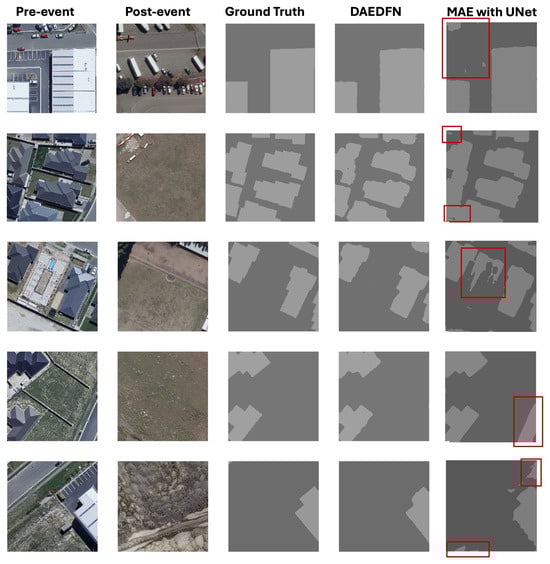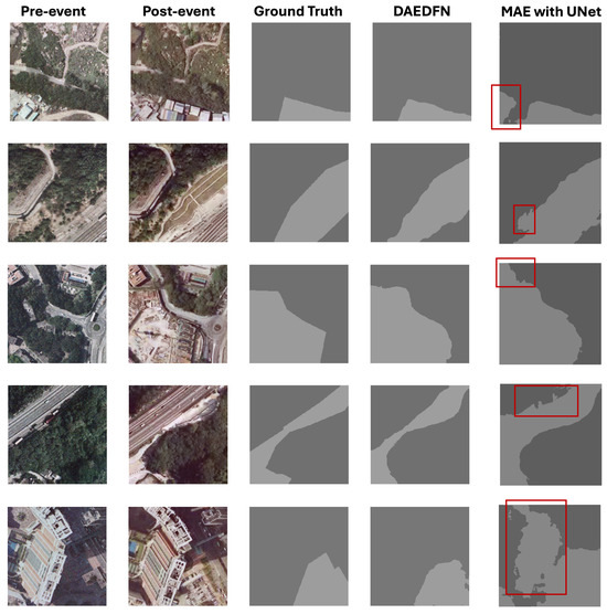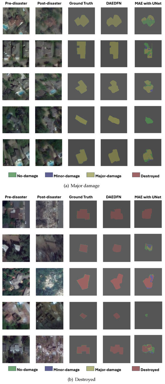 Furthermore, Table 4 shows that ST-CRL performs well in detecting No Damage cases, achieving an accuracy of 0.858. However, our proposed DAEDFN model demonstrates superior performance in detecting damaged buildings, particularly in the Minor (0.555), Major (0.594), and Destroyed (0.760) categories. In the context of damage assessment, accurately identifying damaged buildings is more critical than overestimating undamaged structures. Our model prioritizes detecting affected buildings, which is essential for post-disaster response and resource allocation.