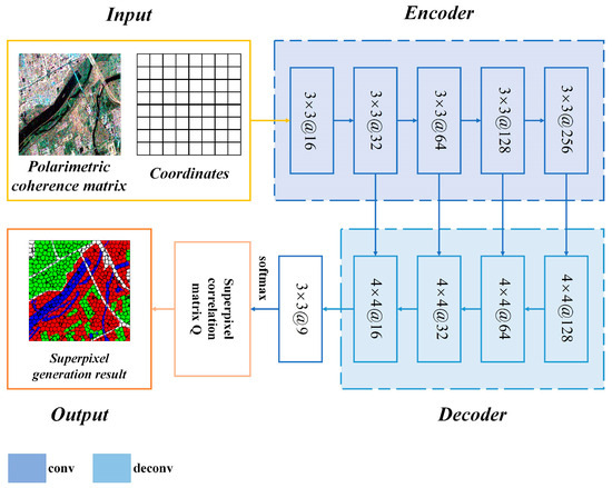As shown in Figure 1, PolSAR-SFCGN is a superpixel generation network and can be combined with the subsequent classification networks directly. PolSAR-SFCGN is defined on a fully convolutional network with an encoder–decoder structure, and its input is the processed polarization coherence matrix. After the training of PolSAR-SFCGN, with the obtained PolSAR superpixels, the subsequent classification network can be trained for PolSAR image classification. It is noted that the classification network can be replaced and designed specifically according to the detailed requirements in the practical applications.