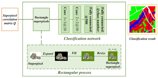 Figure 4 shows the subsequence procedures of the rectangular process and the classification network with the superpixels generated by PolSAR-SFCGN. Here, we just use a very simple and classical convolutional network in PolSAR-CNN [54] as the classification network. The classification networks can be replaced by other complex and effective architectures according to the practical requirements.