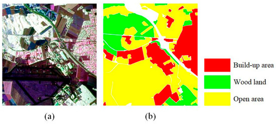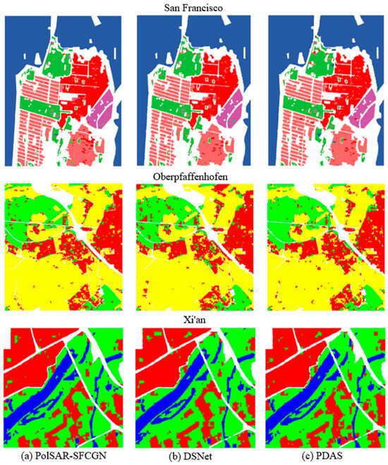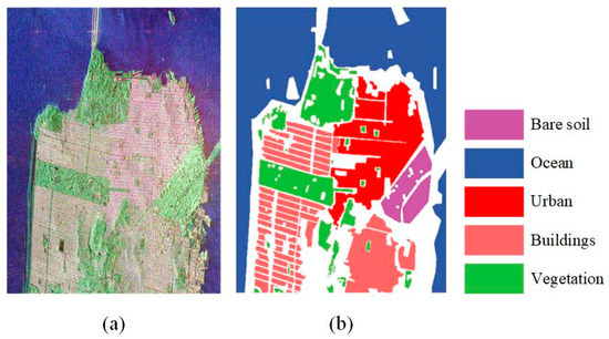 We use the San Francisco dataset, the Oberpfaffenhofen dataset, and the Xi’an dataset to validate the performance of PolSAR-SFCGN. Figure 5, Figure 6 and Figure 7 show the Pauli maps and the ground truth maps of three PolSAR datasets. The PolSAR image of the San Francisco dataset [55] was collected in the United States by the RADARSAT-2 in 2008, with a resolution of 10   m × 5   m and a C-band. The image size is 1895 × 1419 . It contains five types of ground objects, namely buildings, ocean, urban, vegetation, and bare soil. The total number of labeled samples is 1,886,740. The PolSAR image of the Oberpfaffenhofen dataset [56] was collected in Germany by the ESAR airborne platform in 1999, with a resolution of a 3   m × 3   m L-band. The image size is 1300 × 1200 . It contains three types of ground objects, namely build-up area, woodland, and open area. The total number of labeled samples is 1,385,269. The PolSAR image of the Xi’an dataset [57] was obtained in the Weihe River region of Xi’an by the RADARSAT-2, with a resolution of 8   m × 8   m and an image size of 512 × 512 . It contains three types of ground objects, namely Grass, City, And Water.