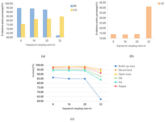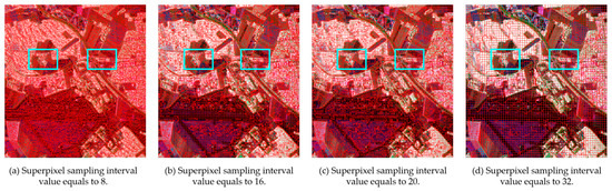 In the superpixel generation, the setting of the superpixel sampling interval affects the size of final superpixels, which also has an impact on the subsequent classification tasks. To illustrate the sensitivity of the superpixel sampling interval in PolSAR-SFCGN, we conduct the experiments on the Oberpfaffenhofen dataset with the superpixel sampling interval set as 8, 16, 20 and 32, respectively. The numerical superpixel segmentation results are shown in Figure 8. When the superpixel sampling interval is set to 8 and 16, the values of BR and UE are close. The values of CO are better when the superpixel sampling interval is set to 16 and 20, but the value of BR is a bit lower when the superpixel sampling interval is set to 20. The superpixel blocks are compacter when the superpixel sampling interval is set to 32 but its BR, UE, and the achievable classification metrics become worse. Obviously, PolSAR-SFCGN is not very sensitive when the superpixel sampling interval is set to no more than 20. Additionally, Figure 9 shows the visual superpixel generation results obtained by PolSAR-SFCGN with different values of superpixel sampling interval. Figure 10 presents the magnified images of the selected regions in the visual superpixel generation results.