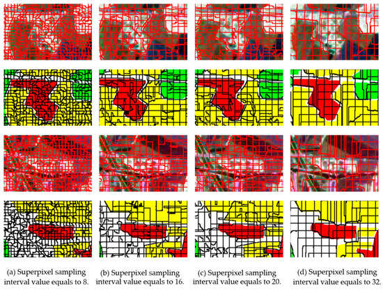 When the superpixel sampling interval equals 8, the generated superpixels have a good ability for boundary fitting. However, the quantity of the superpixels is not a small number, which increases the computational cost of both superpixel generation and the subsequent classification task. When the superpixel sampling interval equals 16, the generated superpixels have regular rectangular shapes while maintaining good compactness and boundary fitting ability. As the superpixel blocks grow larger, despite an improvement in compactness, there is an increase in the misalignment between the superpixel blocks and the real boundaries. Meanwhile, the ability to fit complex boundaries decreases, and the situations where a single superpixel block contains more than one type of ground object begin to emerge. As shown in Figure 10, when the superpixel sampling interval equals 32, the generated superpixels have insufficient fitting performances on the complex boundaries, and a number of superpixel blocks contain several types of ground objects. Considering the performance and efficiency simultaneously, we set the superpixel sampling interval to 16 in PolSAR-SFCGN.