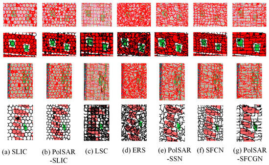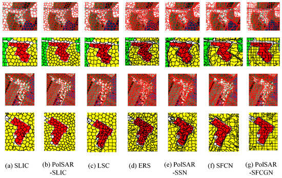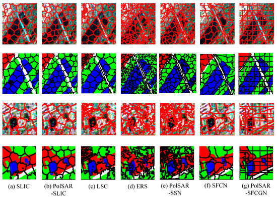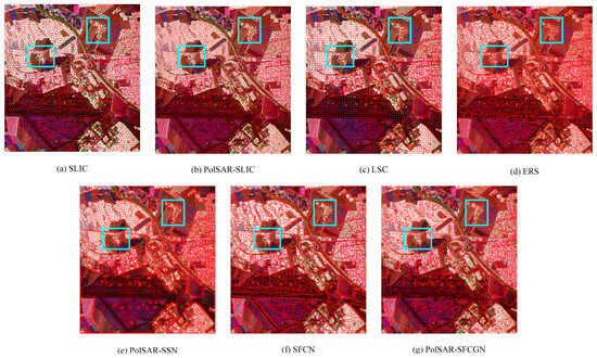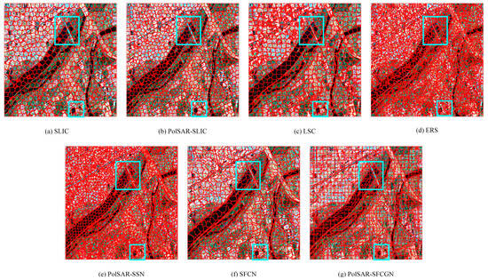 As shown in Figure 11 and Figure 12, the segmentation results of three classical superpixel segmentation algorithms have varying degrees of small-sized irregular superpixel blocks. The superpixels obtained by LSC and ERS have especially irregular and non-compact shapes. The superpixels generated by SLIC, PolSAR-SLIC, PolSAR-SSN, and SFCN are relatively regular and compact, but their boundary fitting abilities are not good enough. The superpixels generated by PolSAR-SFCGN fit the real boundaries better, and most of the superpixel blocks only contain the pixels belonging to one type of ground object, which is consistent with its higher classification metrics in Table 2.