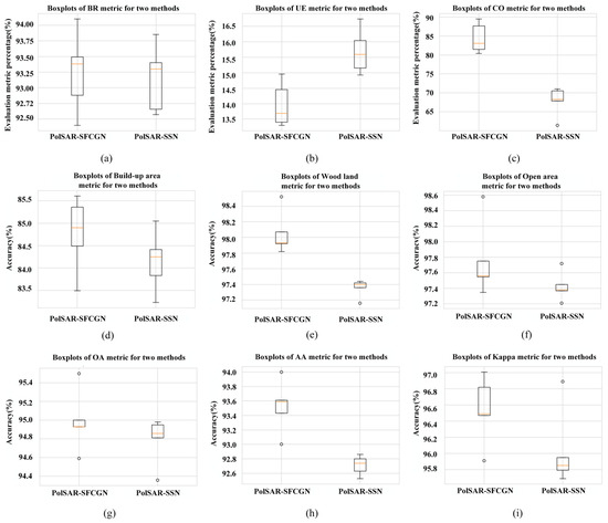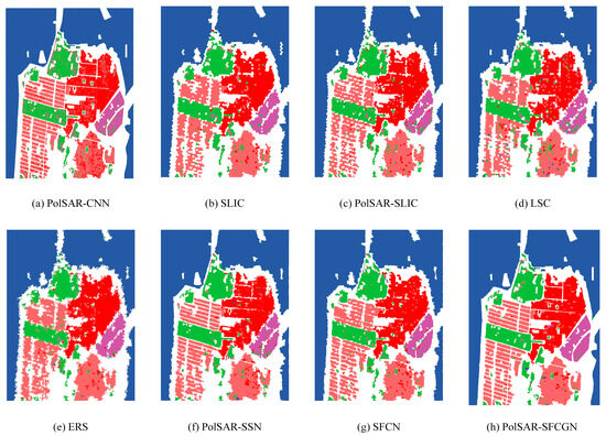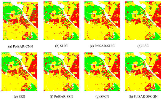 In order to further observe and analyze the qualities of superpixels fairly, the simple classification network described in Section 3.5 is used to obtain the subsequent classification results for PolSAR-SFCGN and other superpixel generation approaches. In the classification experiments with the obtained superpixels, the input rectangular superpixel block size is set to 16 consistently with the superpixel sampling interval. For each type of ground object in the datasets, 30% of superpixels are sampled as the training set, and the other superpixels are used as the test samples. Additionally, we compare the classification results obtained by the above superpixel generation approaches with PolSAR-CNN [54], which is a pixel-based classification network for PolSAR images. In PolSAR-CNN, for each type of ground object in the datasets, 30% of pixels are sampled as the training set, and the other pixels are used as the test samples. For all these contestant approaches, we use the Adam optimizer with the cross-entropy loss function. The initial learning rate is 1 × 10 3 , and the training ends when the learning rate decays to 5 × 10 6 .