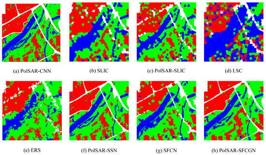 In the comparison experiments, considering the number of superpixels, the initial superpixel size Δ S × Δ S is set as 16 × 16 for all contestant algorithms. Unlike LSC and SLIC, the superpixel number of ERS is set based on initial superpixel size and image size, which are set to 10,000, 6000, and 1000 in the three datasets, respectively. In the training phase of PolSAR-SFCGN, the input images are randomly selected with the sizes of 640 × 640 , 640 × 640 and 320 × 320 on the San Francisco dataset, the Oberpfaffenhofen dataset, and the Xi’an dataset, respectively. The training iteration number of PolSAR-SFCGN is set to 10,000 with a learning rate of 1 × 10 4 , and the learning rate decays to 5 × 10 5 when the iteration number exceeds 5000. In the training phase of PolSAR-SSN, the input images are randomly selected with a size of 320 × 320 as inputs on all three datasets, which is consistent with the original settings in the paper of PolSAR-SSN [6]. The training iteration number of PolSAR-SSN is set to 10,000 with a learning rate of 1 × 10 4 . In the testing phase of PolSAR-SFCGN and PolSAR-SSN, the entire PolSAR images are used as the inputs.