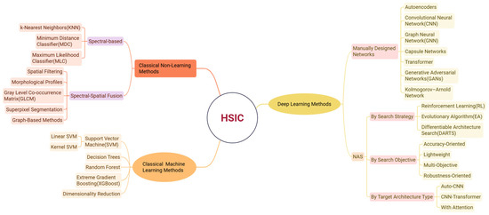 Hyperspectral image classification (HSIC) is one of the core tasks of hyperspectral remote sensing technology, aimed at assigning a unique land cover class label to each pixel in the image [11]. However, classification tasks face numerous challenges due to the high-dimensional nature of hyperspectral data, strong inter-band correlations, and the presence of mixed pixels. A mind map of the HSIC method is shown in Figure 1.
