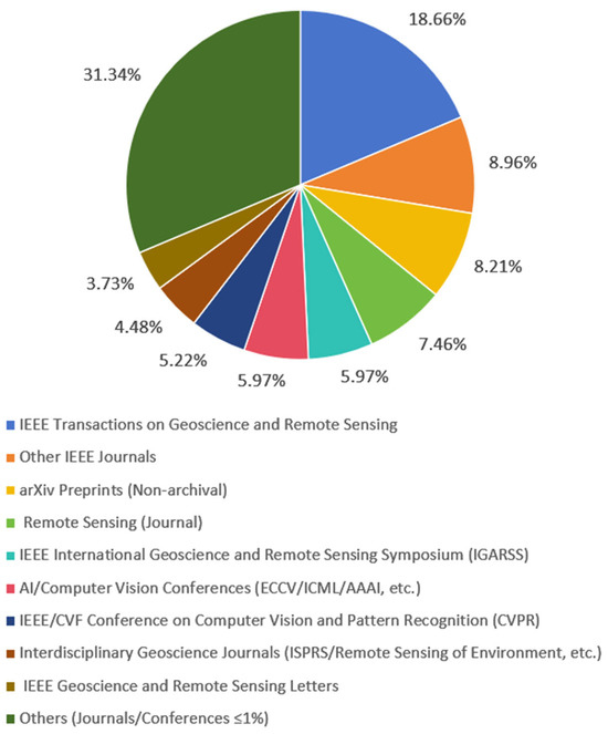 Figure 3 provides a pie chart summarizing the distribution of publication channels for relevant literature in the past five years. The data shows that IEEE Transactions on Geoscience and Remote Sensing is a core journal with a significantly higher proportion than other publications; The IEEE series of journals dominate, reflecting the technological continuity in the traditional field of geoscience and remote sensing. It is worth noting that the proportion of the preprint platform arXiv and the top computer vision conference CVPR indicates an increasing trend of open sharing mode and interdisciplinary technology integration.