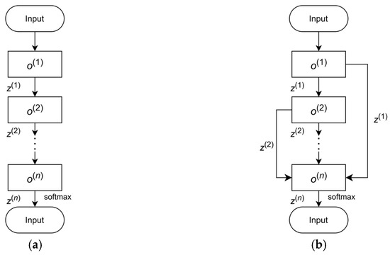 Directed acyclic schematic diagrams of neural networks. (a) Simple chained directed acyclic graph; (b) residual network directed acyclic graph.