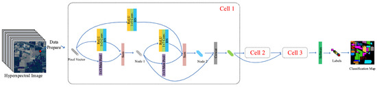 Spatial–Spectral Correlations and Mixed Pixels: Accurate classification of mixed pixels necessitates effective modeling of complex interactions among neighboring pixels (spatial context) and across spectral bands. Thus, the search space must offer sufficient flexibility to identify architectures capable of such fusion. This entails the inclusion of diverse operations such as 2D convolutions (focusing on spatial features), 3D convolutions (joint spatial–spectral modeling), recurrent connections (modeling spectral sequences), attention mechanisms (highlighting informative bands or spatial regions), and skip connections (alleviating vanishing gradients in deeper architectures). The choice between chain-structured or multi-branch architectures—either at the global search space level or within cell-level designs—directly affects the model’s ability to learn complex spatial–spectral relationships. Multi-branch structures, which are commonly adopted in successful NAS designs for HSIC, inherently promote feature fusion, which is critical for handling mixed pixels.