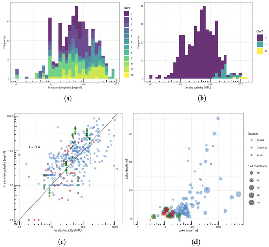 Distribution of (a) chlorophyll-a concentration and (b) turbidity, according to the classification of optical water type. (c) Relationship between chl-a and turbidity. (d) Distribution of lake size and depth in the datasets.