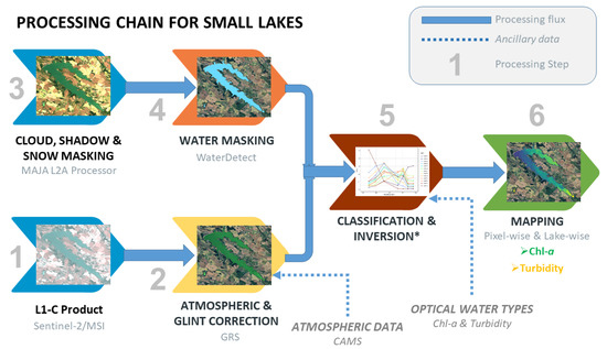 Small lakes (<10 km2) provide a range of ecosystem services but are often overlooked in both monitoring efforts and limnological studies. Remote sensing has been increasingly used to complement in situ monitoring or to provide water colour data for unmonitored inland water bodies. However, due to spatial, radiometric, and spectral constraints, it has been heavily focused on large lakes. Sentinel-2 MSI is the first sensor with the capability to consistently retrieve a wide range of essential water quality variables, such as chlorophyll-a concentration (chl-a) and water transparency, in small water bodies, and to provide long time series. Here, we provide and validate a framework for retrieving two variables, chl-a and turbidity, over lakes with diverse optical characteristics using Sentinel-2 imagery. It is based on GRS for atmospheric and sun glint correction, WaterDetect for water detection, and inversion models that were automatically selected based on two different sets of optical water types (OWTs)—one for each variable; for chl-a, we produced a blended product for improved spatial representation. To validate the approach, we compared the products with more than 600 in situ data from 108 lakes located in the Adour–Garonne river basins, ranging from 3 to ∼5000 ha, as well as remote sensing reflectance (Rrs) data collected during 10 field campaigns during the summer and spring seasons. Rrs retrieval (n = 65) was robust for bands 2 to 5, with MAPE varying from 15 to 32% and achieving correlation from 0.74 up to 0.92. For bands 6 to 8A, the Rrs retrieval was much less accurate, being influenced by adjacency effects. Glint removal significantly enhanced Rrs accuracy, with RMSE improving from 0.0067 to 0.0021 sr−1 for band 4, for example. Water quality retrieval showed consistent results, with an MAPE of 56%, an RMSE of 11.4 mg m−3, and an r of 0.76 for chl-a, and an MAPE of 47%, an RMSE of 9.7 NTU, and an r of 0.87 for turbidity, and no significant effect of lake area or lake depth on retrieval errors. The temporal and spatial representations of the selected parameters were also shown to be consistent, demonstrating that the framework is robust and can be applied over lakes as small as 3 ha. The validated methods can be applied to retrieve time series of chl-a and turbidity starting from 2016 and with a frequency of up to 5 days, largely expanding the database collected by water agencies. This dataset will be extremely useful for studying the dynamics of these small freshwater ecosystems.