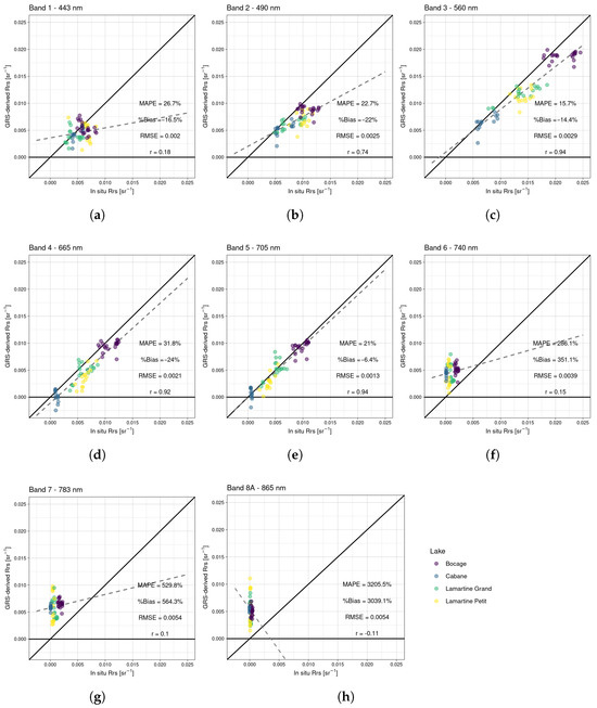 Validation of GRS-derived Sentinel-2 Rrs with the in situ Rrs measurements collected over the four lakes (n = 65) from March to July 2024, from band 1 to band 8A (a–h).