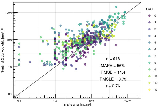 Figure 6 presents the validation of chl-a, comparing the in situ with satellite-derived chl-a. The method is consistent, with alignment of the data points with the 1:1 line. The metrics found were MAPE of 56%, RMSE of 11.4 mg m−3, RMSLE of 0.73, and r of 0.76. For the different datasets, the metrics are similar: for the AEAG dataset, we found an MAPE of 55%, an RMSE of 11.7 mg m−3, an RMSLE of 0.70, and an r of 0.79, and for the gravel lakes dataset, we found an MAPE of 61%, an RMSE of 7.1 mg m−3, an RMSLE of 0.64, and an r of 0.66. This shows that the method is consistent across the two different data acquisition types. The metrics are also consistent across the different temporal window sizes (Table S2), with a small decrease in the MAPE (from 56% to 48%) when considering only same-day acquisitions. In addition, there is no visible influence of OWT on the accuracy, i.e., the method is robust across all OWTs found in the lakes, with the exception of OWTs 10, 11, and 13 for which very few match-ups (none for class 10) were found, so there is a higher uncertainty over the applicability of the selected models. There is a slight tendency to overestimate small values, which are hard to estimate due to all the uncertainties in the remote sensing data. Some outliers were also observed, estimated mostly using the NIR-Red band ratio algorithms.