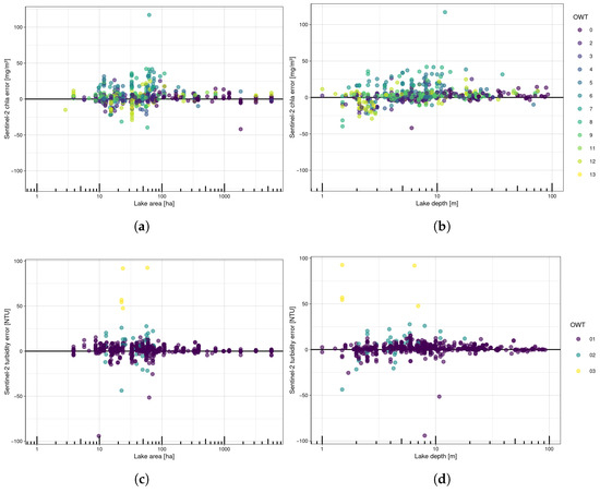 Retrieval errors for (a,b) chlorophyll-a concentration and (c,d) turbidity as a function of lake area (a,c) and depth (b,d).