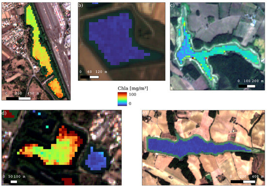 Spatial maps of chlorophyll-a concentration for lakes (a) Bocage (on 3 October 2018), (b) Cabane (on 3 October 2018), (c) Graoussettes (on 17 September 2020), (d) Lamartine Grand and Lamartine Petit (on 3 October 2018), and (e) Laragou (on 3 October 2018). The chl-a products were clipped by the polygons of the water bodies with an inward buffer of 30 m to avoid the effects of mixed pixels, and are superimposed on the original Sentinel-2 images from the same date.