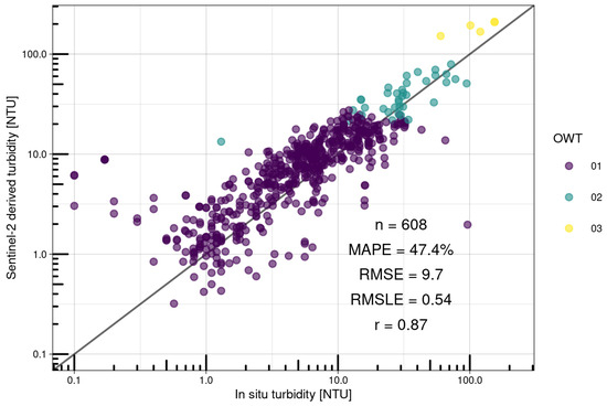 Figure 9 shows the comparison between in situ and satellite-derived turbidity. The method is consistent, with an even better alignment of the data points to the 1:1 line in comparison to chl-a, and very few outliers, mostly caused by overestimation of small values. However, there is one data point where the classification scheme failed, resulting in a significant underestimation. The metrics found were MAPE of 47%, RMSE of 9.7 NTU, RMSLE of 0.54, and r of 0.87. For the different datasets, the metrics are a bit different as a function of the different water transparencies found in each dataset (the gravel pit lakes have generally clear waters): for the AEAG dataset, we found an MAPE of 44%, an RMSE of 10.7 NTU, an RMSLE of 0.54, and an r of 0.87, and for the gravel lakes dataset, we found an MAPE of 87%, an RMSE of 3.9 NTU, an RMSLE of 0.72, and an r of 0.85. The results demonstrate that the method for turbidity is also consistent over the two different data acquisition types. Unfortunately, however, very few match-ups were found for OWT 3 (designed for SPM between 50 and 500 mg L−1), making it difficult to fully assess the accuracy of this model. The metrics are also consistent across the different temporal window sizes (Table S3), with a progressive decrease in RMSE (from 9.7 to 7.7 NTU for same-day acquisition) which results mostly from a reduction in the number of samples with higher turbidity.
