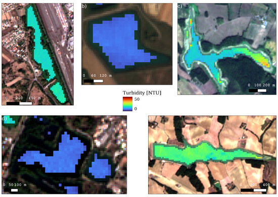 Spatial maps of turbidity for lakes (a) Bocage (on 3 October 2018), (b) Cabane (on 3 October 2018), (c) Graoussettes (on 17 September 2020), (d) Lamartine Grand and Lamartine Petit (on 3 October 2018), and (e) Laragou (on 3 October 2018). The turbidity products were clipped by the polygons of the water bodies with an inward buffer of 30 m to avoid the effects of mixed pixels, and are superimposed on the original Sentinel-2 images from the same date.