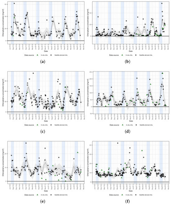 Time series of satellite-derived lake mean chlorophyll-a concentration and in situ measured data for the four monitored lakes in this study and the two additional lakes: (a) Lake Bocage, (b) Lake Cabane, (c) Lake of Graoussettes, (d) Lake Lamartine Grand, (e) Lake Lamartine Petit, and (f) Lake Laragou. The curve with shaded areas represents a filtered time series calculated using an LOESS function (locally estimated scatter plot smoothing, n = 50, α = 0.1), and the blue bars indicate the duration of summer. Note the different scales for each plot.