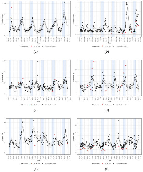 Time series of lake-mean satellite-derived turbidity and in situ measured data for the four monitored lakes in our study and the two additional lakes: (a) Lake Bocage, (b) Lake Cabane, (c) Lake of Graoussettes, (d) Lake Lamartine Grand, (e) Lake Lamartine Petit, and (f) Lake Laragou. The curve with shaded areas represent a filtered time series calculated using an LOESS function (locally estimated scatter plot smoothing, n = 50, α = 0.1), and the blue bars indicate the duration of summer. Note the different scales for each plot.