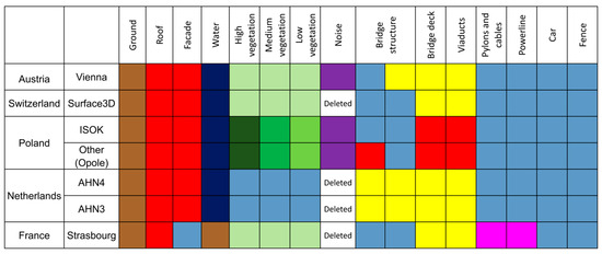 The differences between classification schemes for each country are presented in Figure 1. The colors correspond to the ASPRS definition of classes in las files. The same color indicates objects that belong to the same class in a certain dataset. Figure 1 presents only the differences in objects that are present in the point cloud most frequently. More subtle classification differences may also occur in the point clouds, especially in regards to the objects that belong to the ‘other’ class. As a result, it is possible that the accuracy of classification results of the ‘other’ class may be lower than in the case of the rest of the classes.