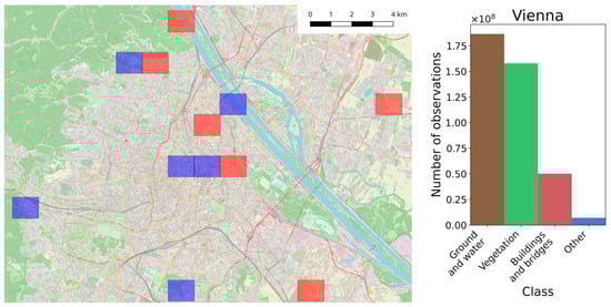 Vienna dataset: left—locations of training (red) and testing (blue) tiles; right—histogram of classes occurrences in the training dataset.
