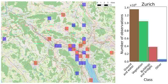 Zurich dataset: left—locations of training (red) and testing (blue) tiles; right—histogram of classes occurrences in the training dataset.