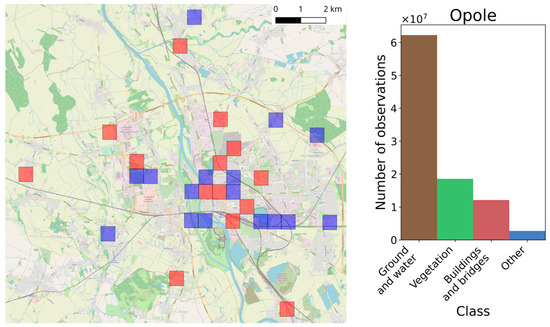 In each city, a set of training and testing tiles was selected. The training and testing tiles were selected in a way so that they represent both the most common objects that are present in the point clouds representing cities as well as more unusual objects. As a result, the following objects are always present in the training tiles: railways, viaducts, rivers, bridges, monuments (if present), different types of buildings (i.e., multi-family, single-family, industrial buildings, shopping centers, and churches), parks, roads (i.e., narrow city roads, highways, etc.), cemeteries, sport facilities, construction sites, etc. In order to make the classifier more robust, tiles were also chosen outside of the cities in the nearby villages and woods. The location of the tiles together with histograms representing class frequencies for each of the datasets are presented in Figure 2, Figure 3 and Figure 4.