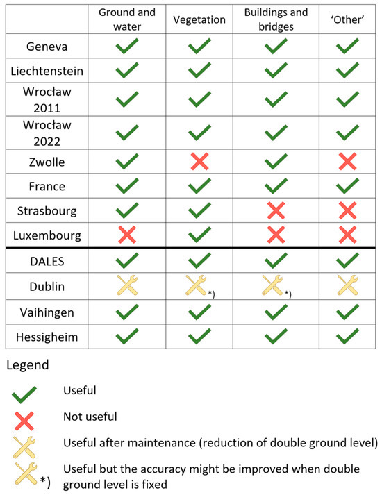 The validation data included selected tiles of ALS point clouds from Geneva, Liechtenstein, Wrocław (acquired in 2011 and 2022), Zwolle, France, Strasbourg, Luxembourg, British Columbia, Vaihingen, Hessigheim, and Dublin. The basic characteristics of these point clouds are presented in Table 1. The usability of these datasets might be restricted to selected classes due to differences in classification schemes and classification errors. The summary of the usability of each dataset is presented in Figure 5.