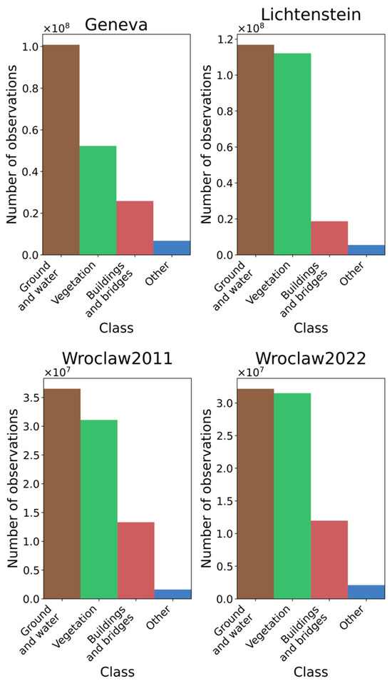 In the case of Swiss data, the Geneva and Liechtenstein ALS data were selected. The histograms of class occurrences for each dataset are presented in Figure 6. The city of Geneva is located on the other side of the country than Zurich and, as a result, it was collected during different measurement campaigns. On the other hand, Liechtenstein is located rather close to Zurich and the ALS data were collected during the same measurement campaign. However, they are characterized by very different terrain structures, as the city is located in a mountainous area. The classification accuracy of both datasets is very high.